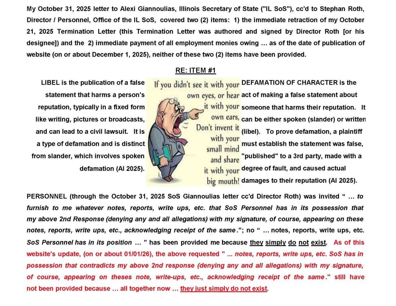 As you have been advised in my letter / e-mail of October 31, 2025, my e-mail of December 2, 2025, my e-mail of January 3, 2026 and my e-mail of February 3, 2026 (copies are provided in the https://secretary-alexi-giannoulias-unhappy-camper-website.com), my employment was terminated, via a letter hand-delivered to me by Jeremy McAlpin, Regional Director / Department of Motor Vehicles (“DMV”), Office of the Illinois Secretary of State, the morning of October 21, 2025 @ the Bloomington, IL DMV facility. (As you recall, I was offered a full time Public Service Representative position [via Steven T. Miller, Personnel Associate] later that same afternoon!) The 1st paragraph of this letter reads: “This letter is to advise you that you are being discharged as a probationary employee with the Office of the Secretary of State. Your probationary discharge is effective at the close of business on October 21, 2025. (Is it just a coincidence that October 21, 2025 is a mere ten [10] days from the end of my six [6] month probation period [as you know or may not be aware, post probation affords me Loudermill rights and protection]?)(1) This action is In accordance with Department of Personnel Rule 420.430(j).(2) The reason for the discharge is as follows: